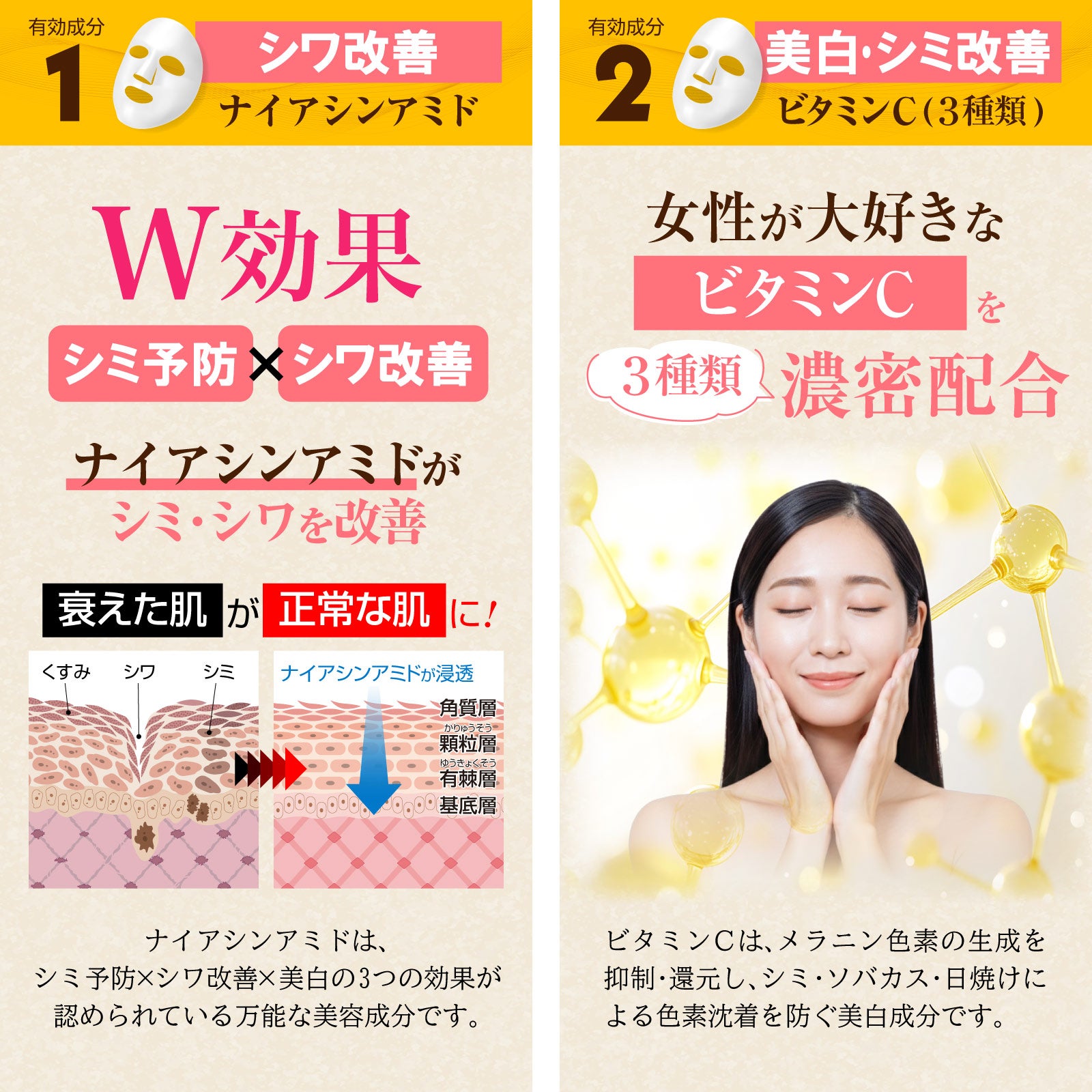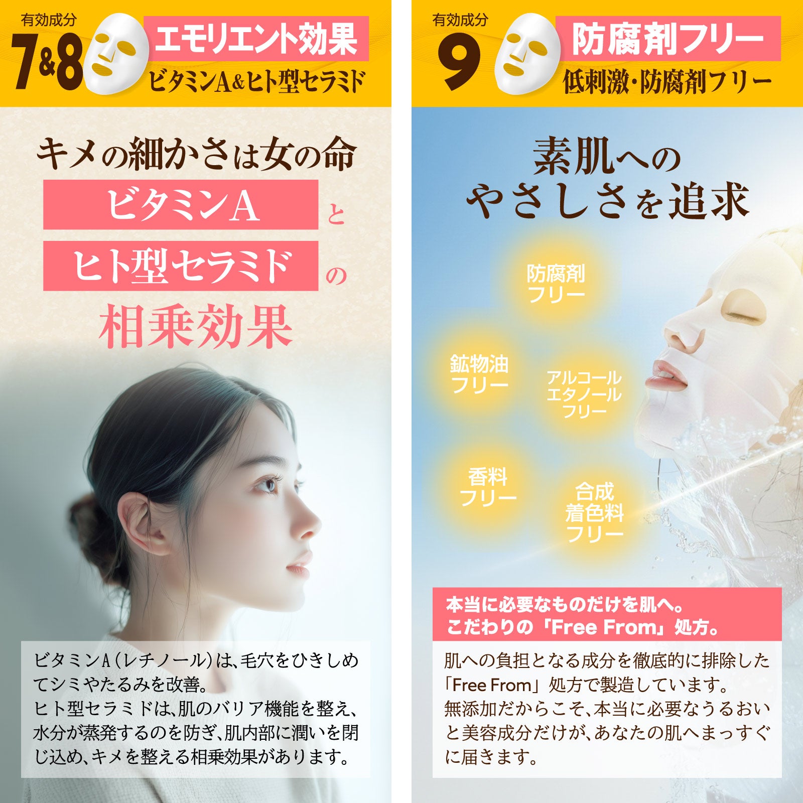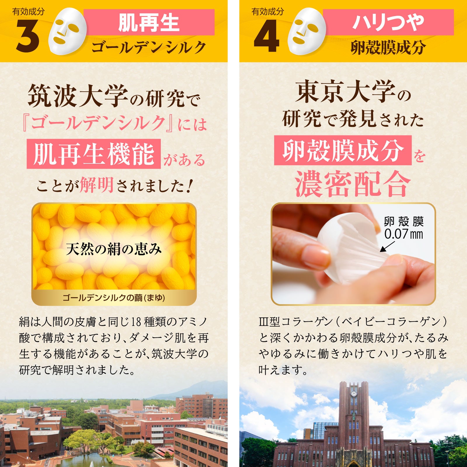 加水分解シルク(ゴールデンシルクエキス)、ナイアシンアミド、加水分解卵殻膜(卵殻膜成分)、Ⅲ型コラーゲン(ベイビーコラーゲン)、加水分解コラーゲン、水溶性コラーゲン、アセチルヒアルロン酸Na(スーパーヒアルロン酸)、ヒアルロン酸Na、加水分解ヒアルロン酸、セラミドNP(ヒト型セラミド)、パルミチン酸アスコルビルリン酸3Na(高浸透型ビタミンC誘導体)、アスコルビルグルコシド(持続型ビタミンC誘導体)、リン酸アスコルビルMg(ビタミンC誘導体)、水添レチノール(ビタミンA誘導体)、グリセリン、BG、メチルグルセス-20、セイヨウサンザシ果実エキス、セイヨウノコギリソウエキス、セージ葉エキス、タチジャコウソウ花/葉エキス、カニナバラ果実エキス、ラベンダー花エキス、ローズマリー葉エキス、ポリクオタニウム-51、グリチルリチン酸2K、キサンタンガム、EDTA-2Na、ヒドロキシアセトフェノン、PEG-60水添ヒマシ油、クエン酸、クエン酸Na、フェノキシエタノール、トリ(カプリル酸/カプリン酸)グリセリル