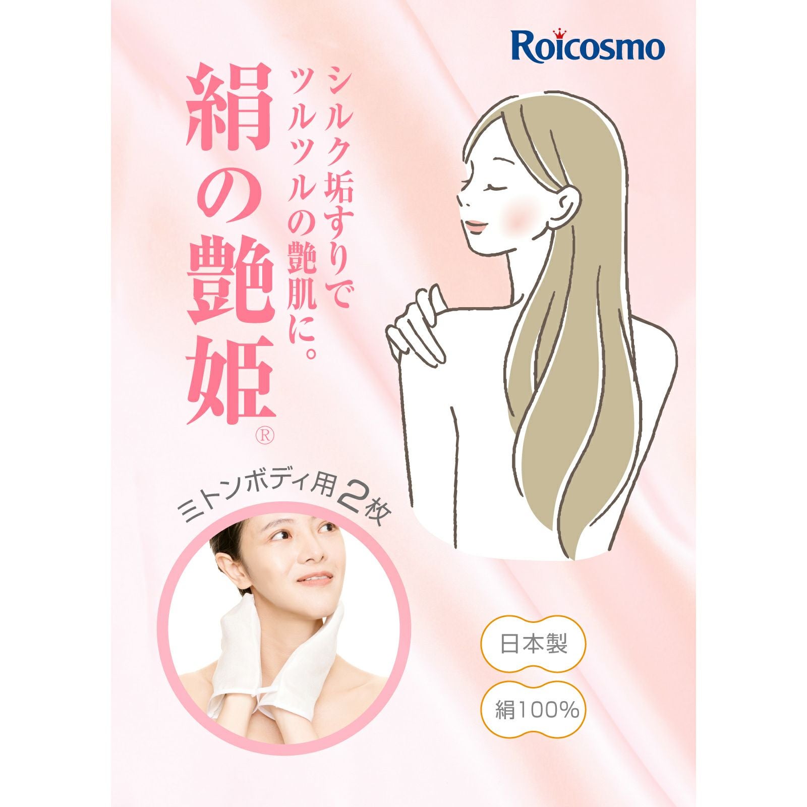 ROICOSMO 垢すり あかすり 日本製 シルク垢すり シルク100% 美容整形や化粧品でも無理だった「ヒザの黒ずみ」「ヒジの黒ずみ」「毛穴のザラつき」「背中のブツブツ」などの悩みを解消 しかも全身ツルツルのつや肌になります 絹の艶姫 シルク 垢すり ミトン ボディ用×2枚