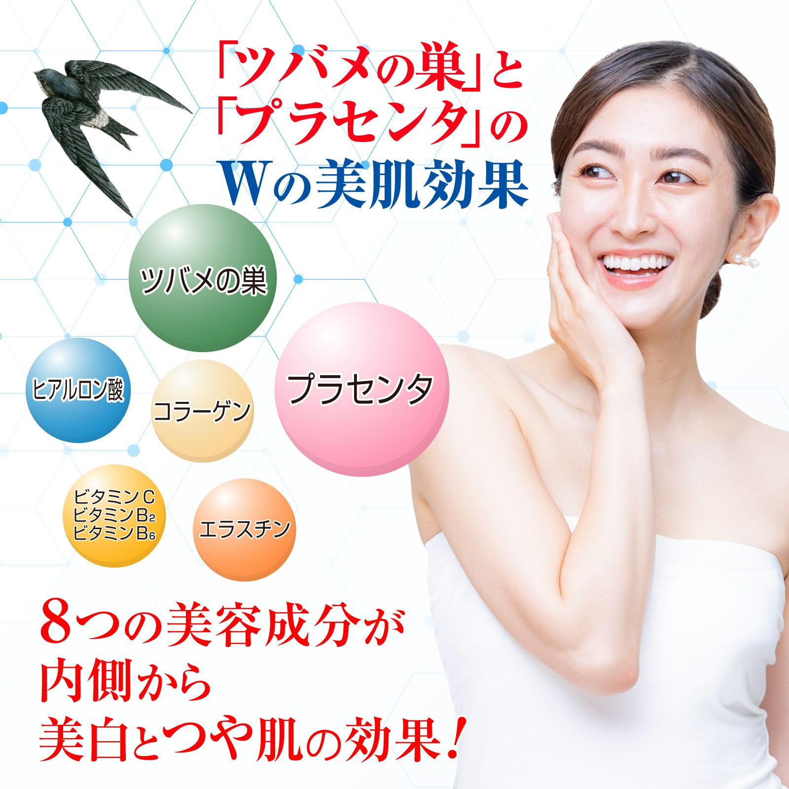 プラセンタエキス(SPF豚由来)、フィッシュコラーゲンペプチド、エリスリトール、ツバメの巣末、エラスチン(魚由来)、ビタミンC、酸味料、香料、甘味料(スクラロース、ソーマチン、ネオテーム)、ヒアルロン酸、ビタミンB2、ビタミンB6、(原材料の一部にゼラチンを含む)