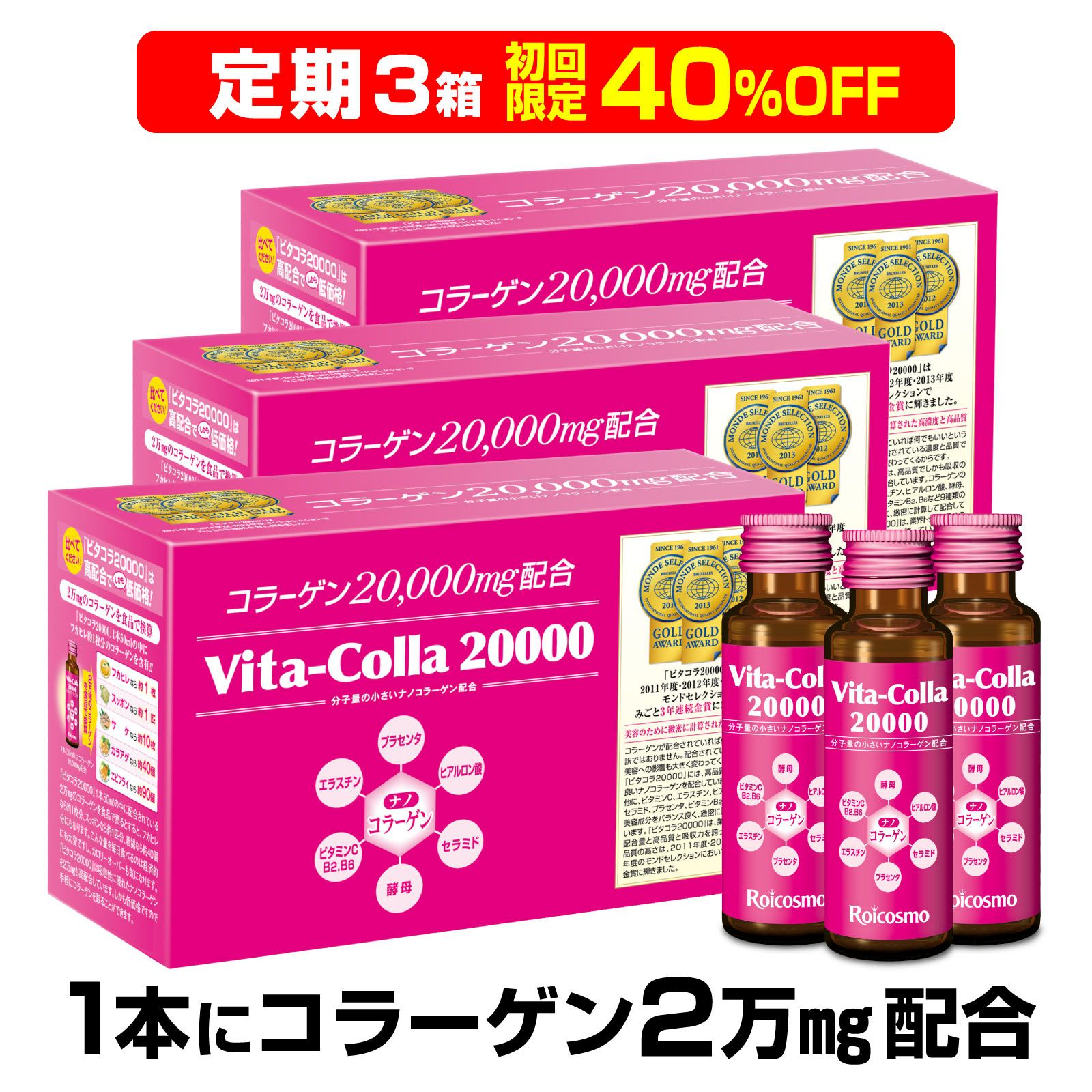 他の画像を見る 定期コース 定期販売 初回特別価格あり ROICOSMO 1本50mLにコラーゲン2万mg配合は業界No.1 高濃度 コラーゲンドリンク プラセンタ ヒアルロン酸も 高配合 高品質 コラーゲン 美容ドリンク 【定期初回40%OFF】ビタコラ20000 (50mL) 10本入り×3箱 1回あたり ¥ 9,552 税込 モンドセレクション3年連続金賞受賞 楽天ランキング1位 Amazon's Choice 認定 詳細を見る お気に入りに保存
