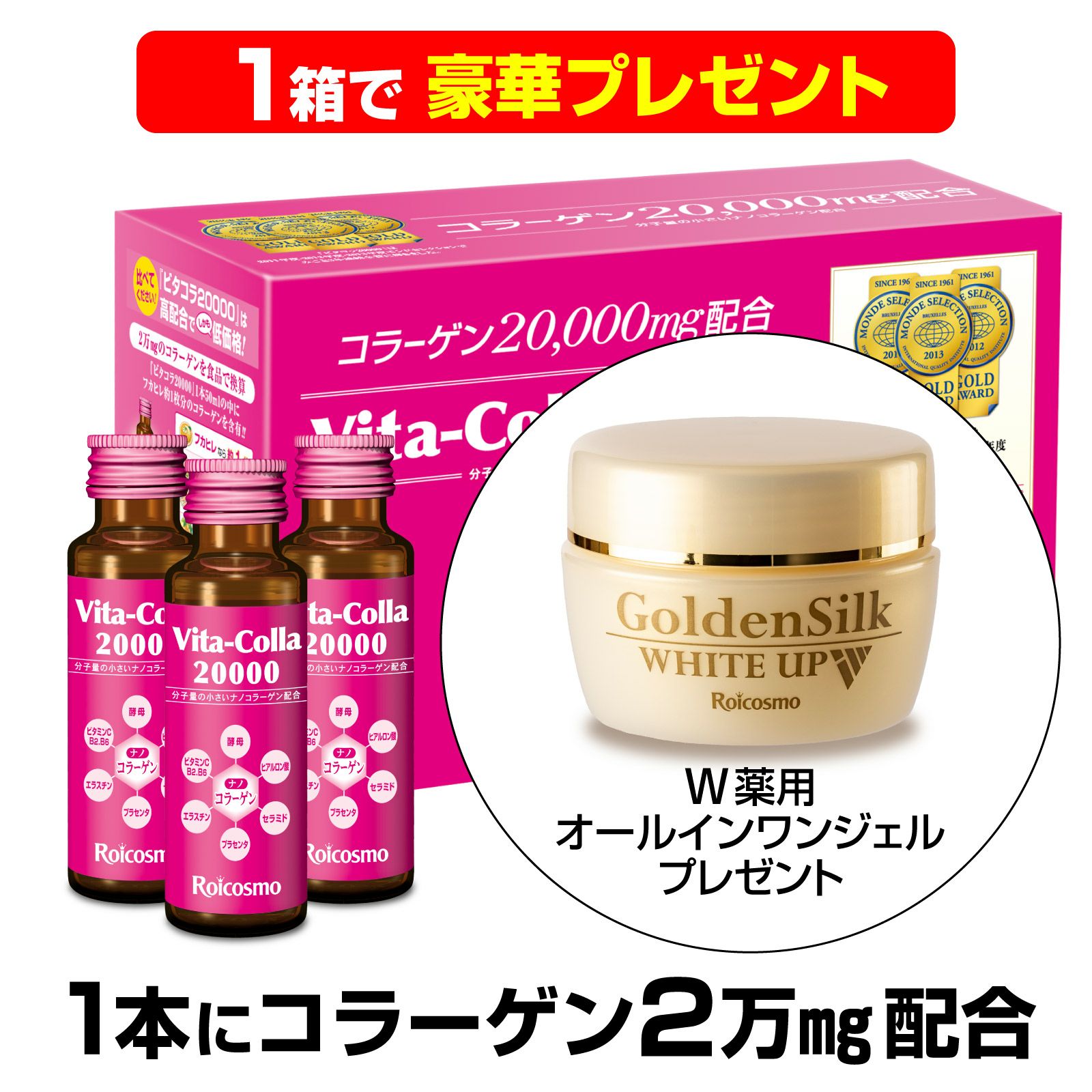 他の画像を見る プレゼント付 ROICOSMO 1本50mLにコラーゲン2万mg配合は業界No.1 高濃度 コラーゲンドリンク プラセンタ ヒアルロン酸も 高配合 高品質 美容ドリンク 【ホワイトアッププレゼント】ビタコラ20000 (50mL) 10本入り×1箱+ホワイトアップ62g1個 通常価格(税込) : ¥ 8,688 販売価格(税込) : ¥ 3,980 税込 モンドセレクション3年連続金賞受賞 楽天ランキング1位 Amazon's Choice 認定 カートに入れる お気に入りに保存