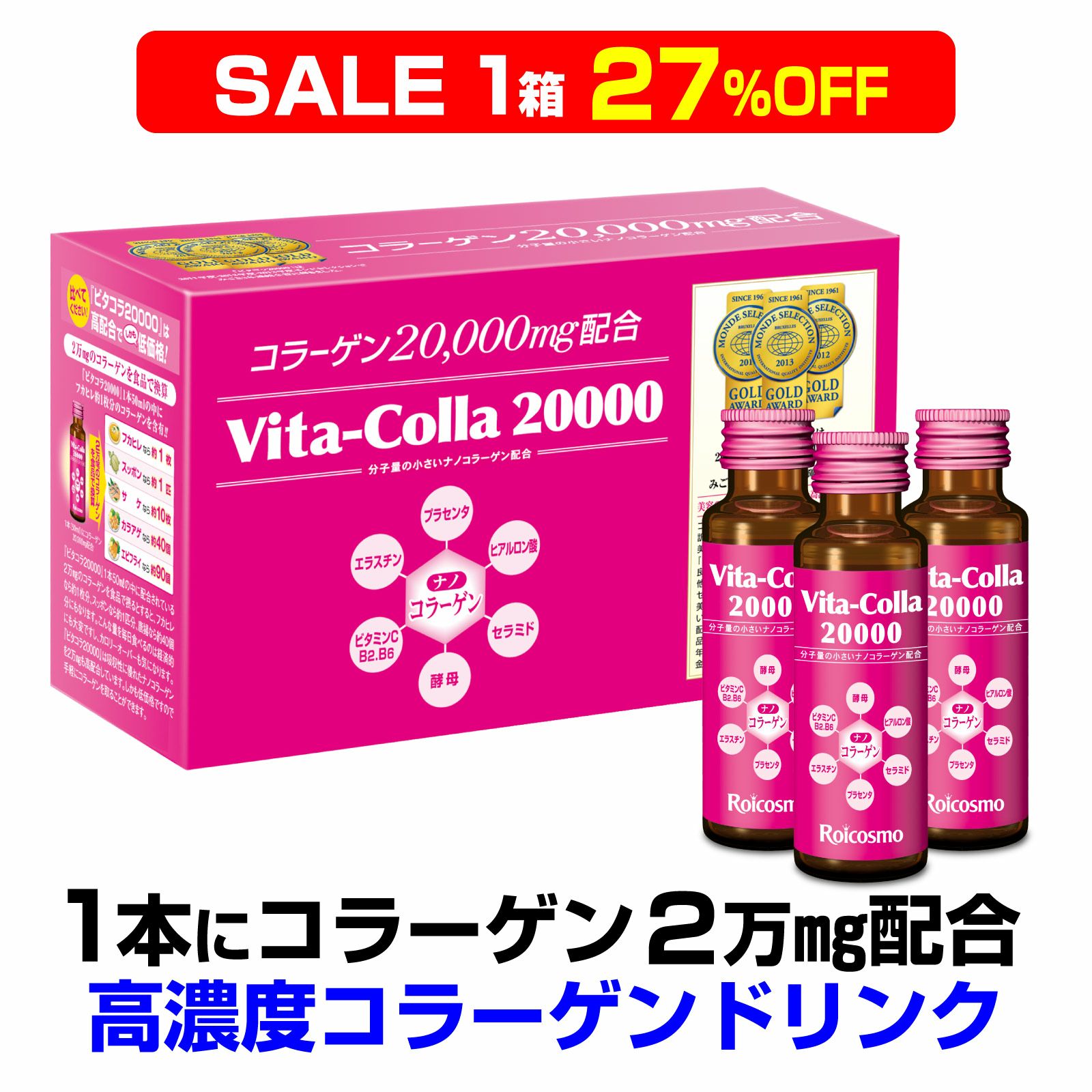 他の画像を見る 定期コース 定期販売 ROICOSMO 1本50mLにコラーゲン2万mg配合は業界No.1 高濃度 コラーゲンドリンク プラセンタ ヒアルロン酸も 高配合 高品質 コラーゲン 美容ドリンク 【定期 1箱 15%OFF】ビタコラ20000 (1本50mL) 高濃度コラーゲンドリンク 即効 サプリ 美容ドリンク 1回あたり ¥ 3,383 税込 モンドセレクション3年連続金賞受賞 楽天ランキング1位 Amazon's Choice 認定 詳細を見る お気に入りに保存